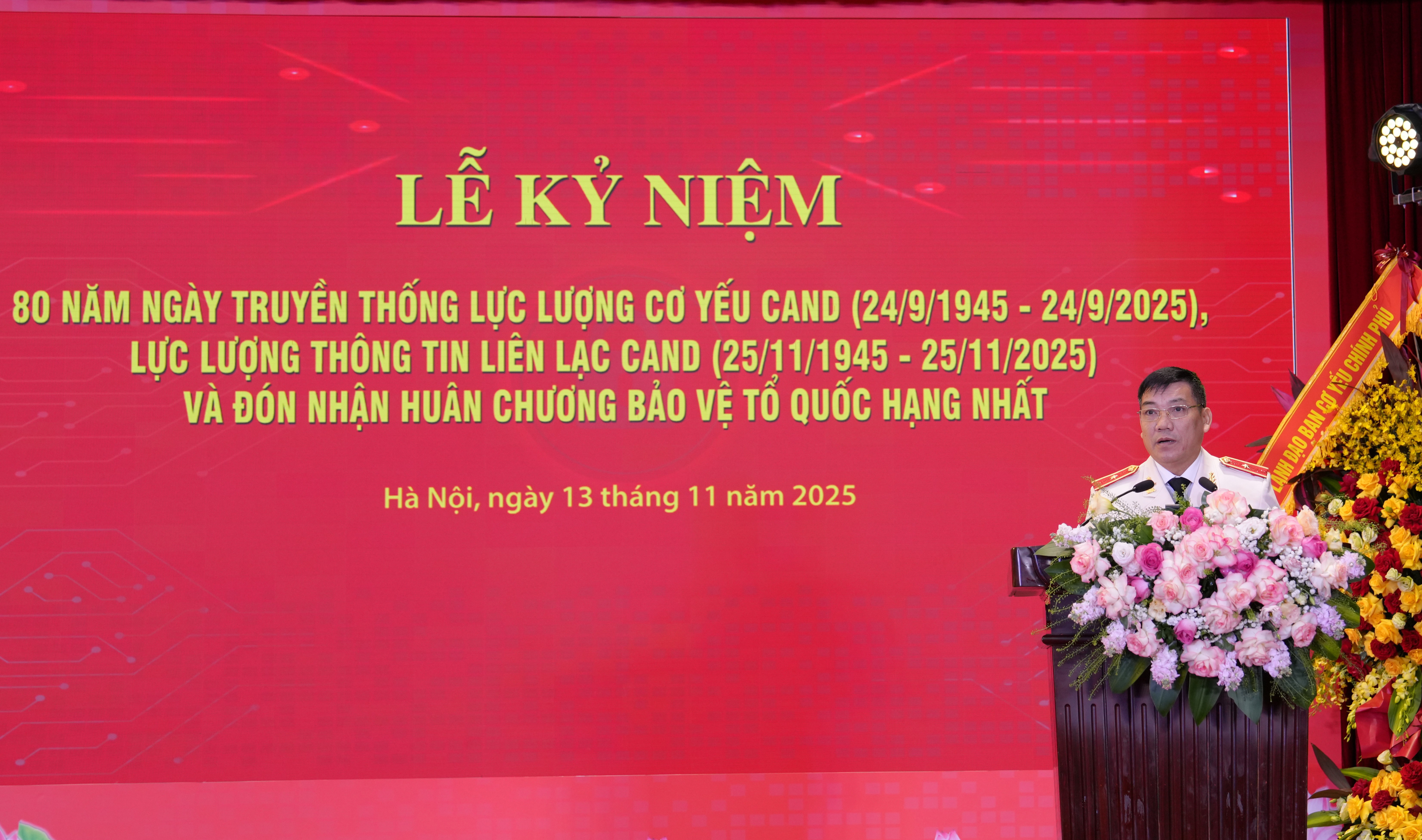 Bích Ngoan15:36 | 13/11/2025Sáng 13/11, tại Hà Nội, Bộ Công an long trọng tổ chức Lễ Kỷ niệm 80 năm Ngày truyền thống lực lượng Cơ yếu Công an nhân dân (24/9/1945 - 24/9/2025) và lực lượng Thông tin liên lạc Công an nhân dân (25/11/1945 - 25/11/2025) và đón nhận Huân chương Bảo vệ Tổ quốc hạng Nhất, phần thưởng cao quý của Đảng, Nhà nước trao tặng. Đại tướng Lương Tam Quang, Ủy viên Bộ Chính trị, Bộ trưởng Bộ Công an đến dự và chỉ đạo buổi Lễ. -