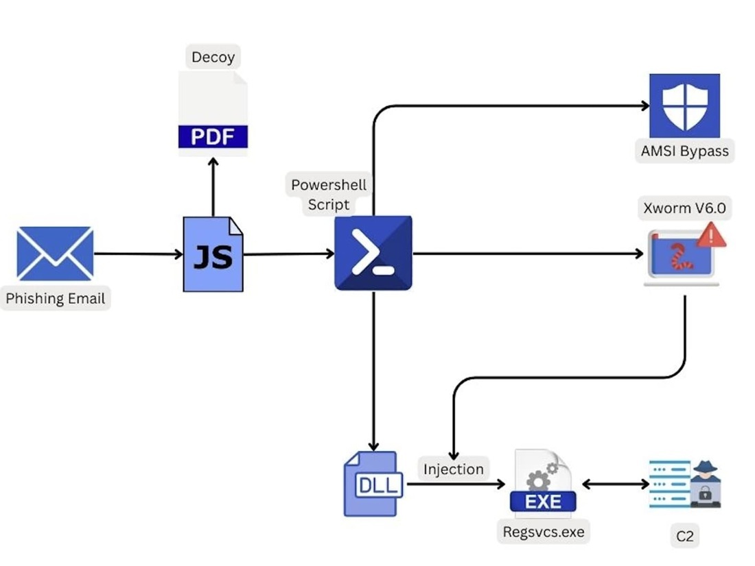 Trong một chiến dịch lừa đảo, phần mềm độc hại được triển khai thông qua một đoạn mã JavaScript độc hại, khởi chạy một tập lệnh PowerShell có thể vượt qua lớp bảo vệ của Antimalware Scan Interface và triển khai XWorm.