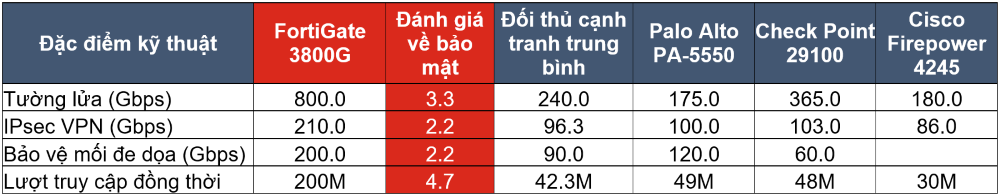 Sức mạnh của dòng sản phẩm FortiGate 3800G mới và Dịch vụ Bảo mật Hỗ trợ AI của FortiGuard được thể hiện trong bảng Xếp hạng bên dưới, so sánh các tường lửa hàng đầu trên thị trường với các chỉ số hiệu suất mục tiêu của FortiGate 3800G.