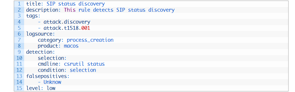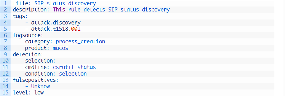 Để phát hiện hoạt động này, bạn cần giám sát lệnh csrutil status. Kẻ tấn công thường kiểm tra trạng thái SIP để tìm các tùy chọn khả dụng. Vì chúng triển khai csrutil disable ở Recovery Mode, trước khi tải bất kỳ giải pháp giám sát nào, lệnh này không được ghi lại và do đó việc theo dõi việc thực thi lệnh là vô nghĩa. Thay vào đó, bạn có thể thiết lập giám sát trạng thái SIP và nếu trạng thái thay đổi, hãy gửi cảnh báo bảo mật.