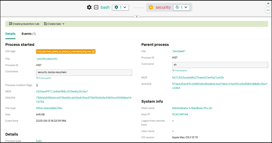 Để phát hiện các cuộc tấn công như thế này, yêu cầu cần phải cấu hình ghi log các sự kiện khởi động tiến trình. Phương pháp tốt nhất để thực hiện là sử dụng công cụ ghi log macOS tích hợp sẵn, ví dụ ESF. Trong số các sự kiện cần thiết để phát hiện hoạt động được mô tả, có những sự kiện chứa các lệnh “security dump-keychain” và “security list-keychains”, vì hoạt động này không diễn ra thường xuyên đối với người dùng macOS thông thường. Dưới đây là ví dụ về việc kích hoạt EDR trên sự kiện dump Keychain, cũng như ví dụ về tập luật phát hiện.