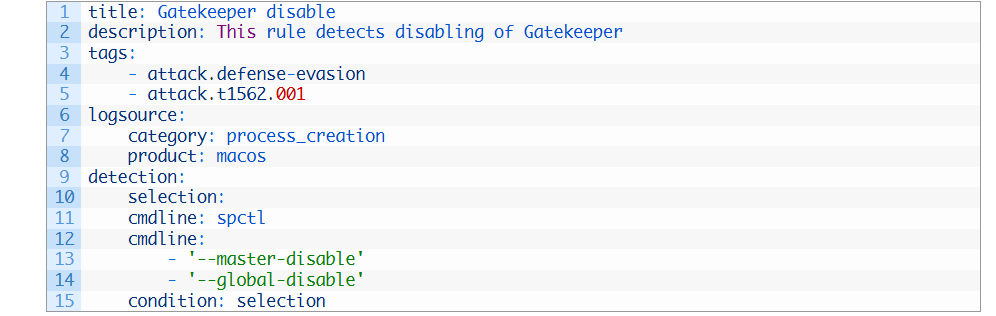 Để phát hiện hoạt động này, bạn cần giám sát việc thực thi lệnh spctl bằng các tham số –master disable hoặc --global-disable, để vô hiệu hóa Gatekeeper. Dưới đây là ví dụ về EDR kích hoạt khi có sự kiện vô hiệu hóa Gatekeeper, cũng như ví dụ về tập luật phát hiện.