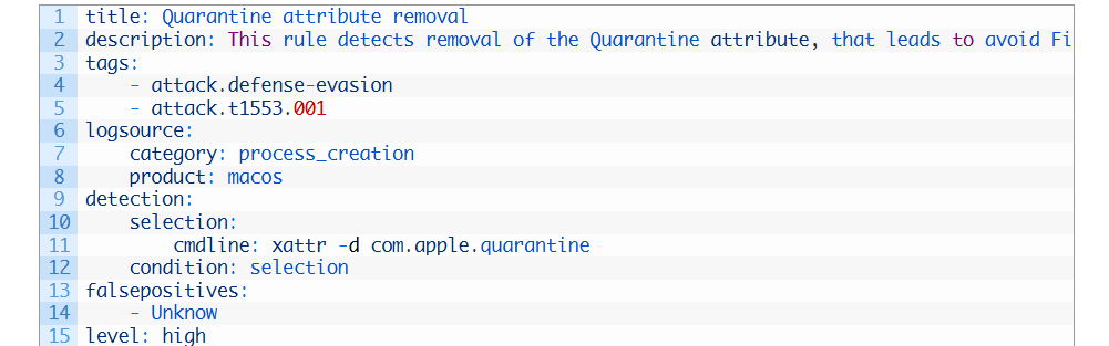 Để phát hiện hoạt động này, bạn cần giám sát việc thực thi lệnh “xattr” kết hợp với “-d” và “com.apple.quarantine”, ngụ ý việc xóa thuộc tính quarantine. Trong một sự cố liên quan đến việc xâm nhập macOS, nguồn gốc của tệp cũng cần được điều tra: Nếu tệp được tải lên máy chủ mà không bị quarantine đánh dấu, đây là một yếu tố rủi ro bổ sung. Dưới đây là một ví dụ về việc kích hoạt EDR khi có sự kiện xóa thuộc tính quarantine, cũng như ví dụ về tập luật phát hiện các sự kiện như vậy.