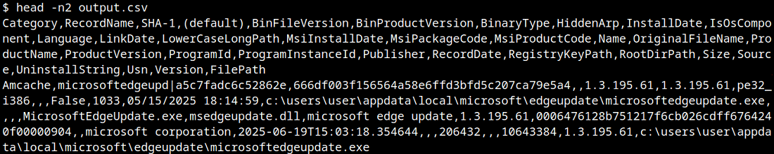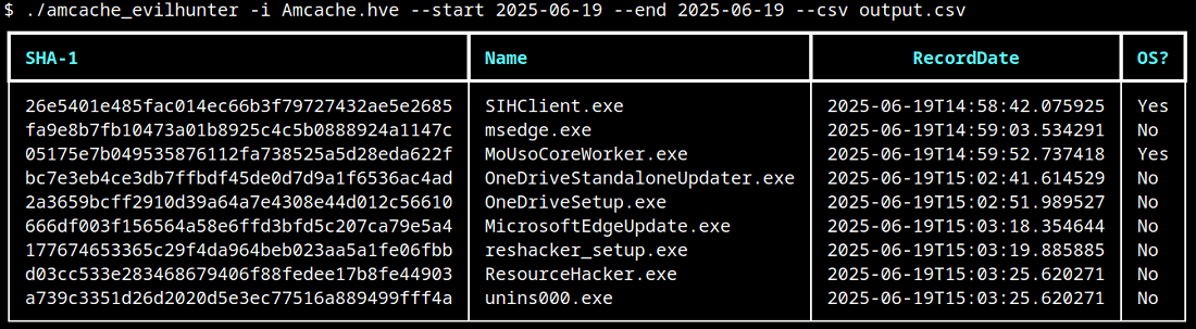 Hình ảnh bên dưới hiển thị ví dụ về việc thực thi AmCache-EvilHunter với các tùy chọn cơ bản này bằng cách sử dụng lệnh sau: “amcache-evilhunter -i Amcache.hve --start 2025-06-19 --end 2025-06-19 --csv output.csv”. Đầu ra chứa tất cả các ứng dụng có trên máy vào ngày 19/6/2025. Cột cuối cùng chứa thông tin cho biết tệp có phải là thành phần của hệ điều hành hay không.