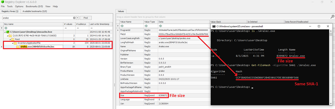 Như đã đề cập trước đó, AmCache chỉ tính toán hàm băm SHA-1 trên 31.457.280 byte đầu tiên. Để chứng minh điều này, các nhà nghiên cứu đã thực hiện một thử nghiệm nhỏ, trong đó họ đã thu được một tệp nhị phân nhỏ hơn 31 MB (Aralez) và một tệp lớn hơn giá trị này (một phiên bản tùy chỉnh của Velociraptor). Trong trường hợp đầu tiên, hàm băm SHA-1 của toàn bộ tệp nhị phân được lưu trữ trong AmCache.