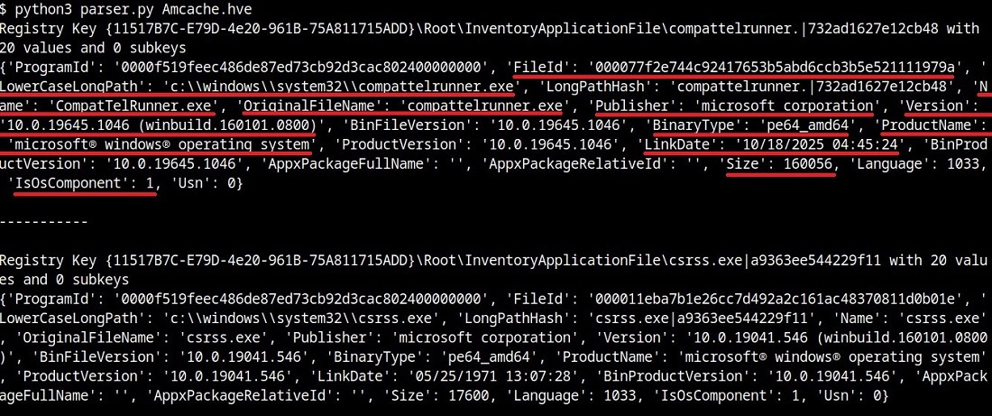 Tệp Amcache.hvel là một tổ hợp Windows Registry ở định dạng REGF, nó chứa nhiều khóa con lưu trữ các lớp dữ liệu riêng biệt. Một trình phân tích cú pháp Python đơn giản có thể được triển khai để lặp lại Amcache.hve và hiển thị các khóa của nó.