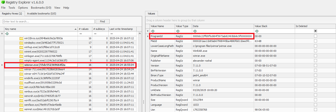 Hình 8. Minh họa ProgramId của phần mềm WinRAR bên dưới InventoryApplicationFile