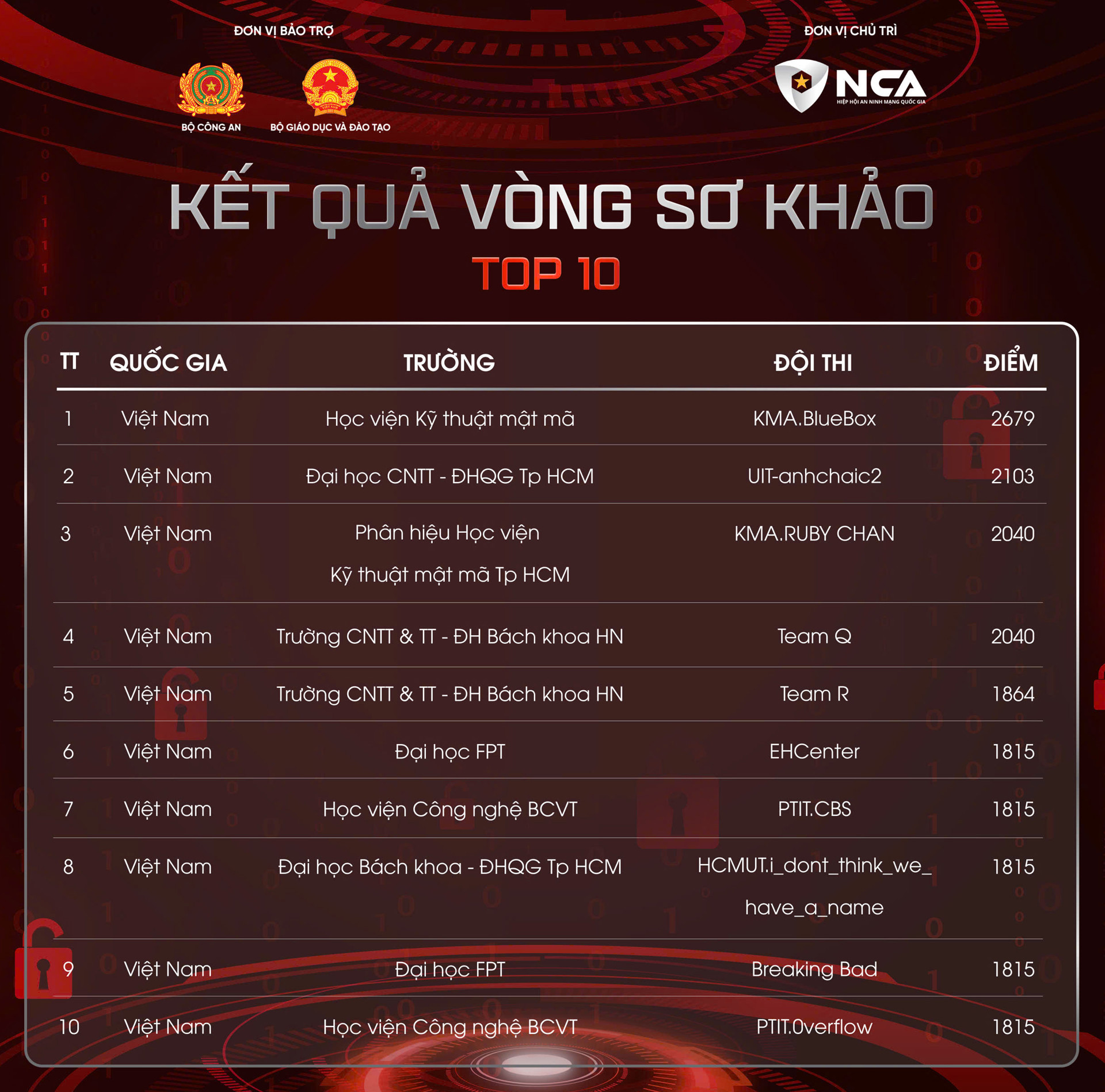 Sau 8 giờ thi đấu liên tục, đội BlueBox đến từ Học viện Kỹ thuật mật mã đã giành ngôi vô địch với 2.679 điểm. Đứng ở vị trí thứ hai là Anhchaic2 của Trường Đại học CNTT - Đại học Quốc gia TP.HCM, hoàn thành 17 thử thách và đạt 2.103 điểm. Đứng thứ 3 là RUBY CHAN của phân hiệu Học viện Kỹ thuật Mật mã TP.HCM khi vượt qua 16 thử thách với tổng điểm 2.040. Đáng lưu ý, Top 10 đều ghi dấu bởi các đội thi đến từ Việt Nam.