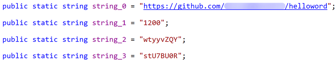 Phần mềm độc hại định vị chuỗi này bằng cách tìm kiếm hai ký tự phân cách, wtyyvZQYvà stU7BU0R, đánh dấu điểm bắt đầu và kết thúc của dữ liệu cấu hình. Các byte của chuỗi này sau đó được giải mã theo chuẩn Base64 và AES để lấy địa chỉ máy chủ C2.