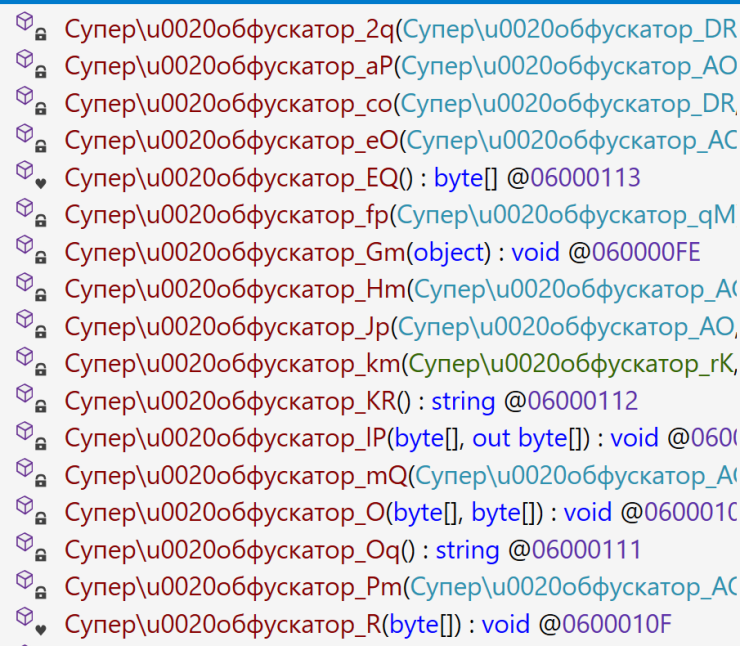 Trong code của các mẫu NeuralExecutor quan sát được vào năm 2024, tên của tất cả các hàm đã được thay thế bằng các chuỗi có tiền tố là “Супер обфускатор”, tạm dịch trong tiếng Anh là “Super obfuscator”. Tuy nhiên, điều quan trọng cần lưu ý là chuỗi này đã được kẻ tấn công cố tình đưa vào khi sử dụng ConfuserEx obfuscator. Khi nói đến các chuỗi được chèn vào phần mềm độc hại một cách có chủ đích, chúng ta cần đánh giá cẩn thận trong quá trình quy kết.