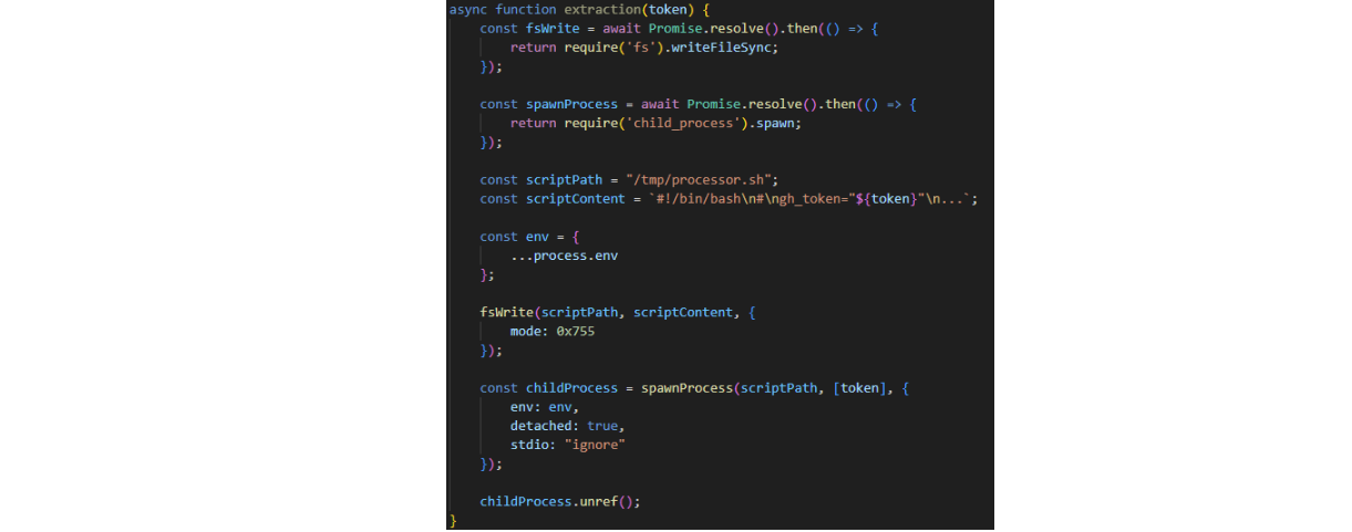 Sau khi vượt qua các bước kiểm tra, phần mềm độc hại sử dụng token đã đề cập trước đó để lấy thông tin về người dùng GitHub hiện tại. Sau đó, nó chạy hàm extraction, tạo một tập lệnh bash tạm thời /tmp/processor[.]sh và chạy nó như một tiến trình riêng biệt, truyền token làm đối số. Hình 1 là hàm extraction, với các chuỗi và tên biến đã được sửa đổi vì thực tế mã nguồn gốc không thể đọc được.