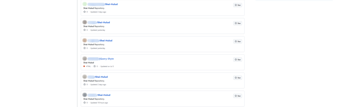 Phương pháp thu thập dữ liệu bất thường này được thiết kế để trích xuất một lần các secret từ kho lưu trữ của người dùng. Tuy nhiên, nó không chỉ gây ra mối đe dọa cho nạn nhân Shai-Hulud mà còn cho cả các nhà nghiên cứu thông thường. Nếu tìm kiếm “shai-hulud” trên GitHub, chúng ta có thể thấy rất nhiều kho lưu trữ đã bị worm này xâm nhập.
