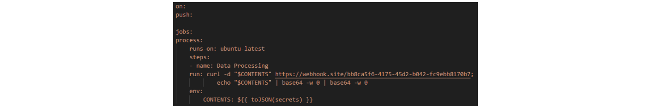 Tệp này thu thập thông tin secret từ kho lưu trữ của nạn nhân và chuyển tiếp đến máy chủ của kẻ tấn công. Trước khi gửi, dữ liệu này mã hóa hai lần bằng Base64.