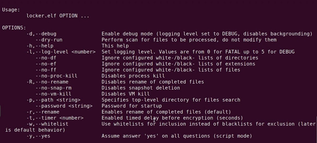 Các đối số dòng lệnh bao gồm các tùy chọn để bật chế độ gỡ lỗi, thực hiện chạy thử mà không mã hóa bất kỳ tệp nào hoặc tùy chỉnh cách mã hóa máy ảo và ảnh snapshot của chúng.