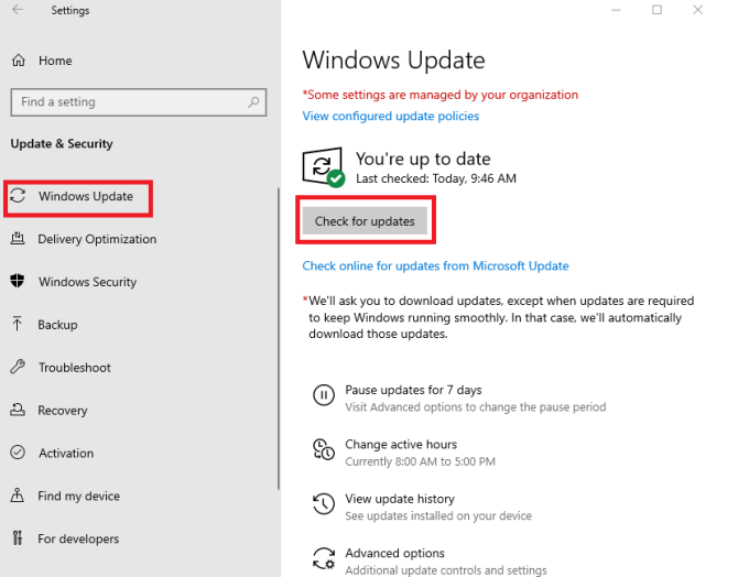 Bước 3: Cửa sổ hiện ra kích chọn Windows Update, tiếp theo chọn Check for updates.