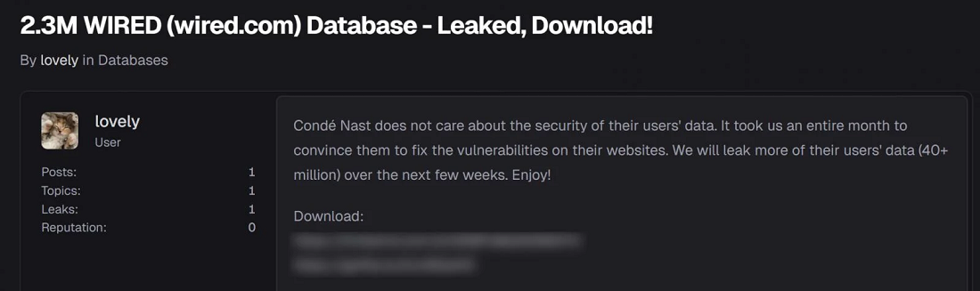 Vào ngày 20/12, tác nhân đe dọa với bí danh “Lovely” đã làm rò rỉ cơ sở dữ liệu của Condé Nast trên một diễn đàn tin tặc, rao bán quyền truy cập với giá khoảng 2,30 USD bằng hệ thống tín dụng của trang web. Trong bài đăng, Lovely cáo buộc Condé Nast phớt lờ các báo cáo về lỗ hổng bảo mật và cho rằng công ty đã không coi trọng vấn đề an ninh.