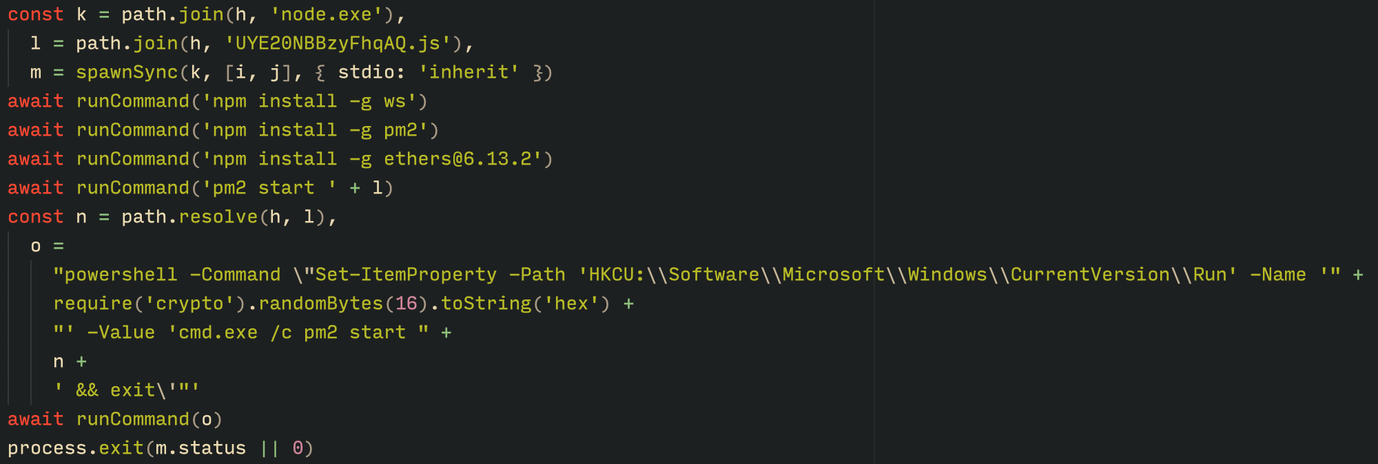 Các tệp đã giải mã này, cùng với một tệp package.json được ghi vào đĩa. Tệp này thông tin về gói Node.js độc hại, cũng như các thư viện cần thiết để cài đặt, bao gồm các gói ws và ethers. Cuối cùng, trình lây nhiễm chạy cả hai tập lệnh, bắt đầu bằng tập lệnh lưu trữ, tiếp theo là tập lệnh bot.