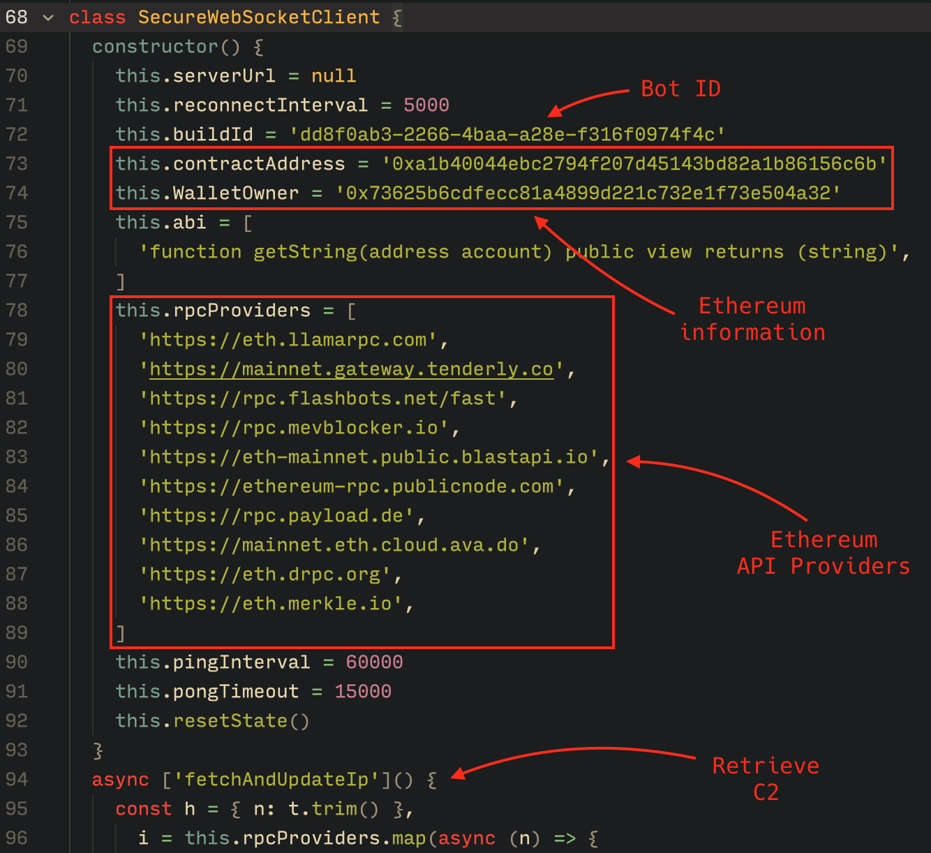 Để lấy địa chỉ C2, bot liên hệ với nhiều điểm cuối công khai cung cấp API gọi thủ tục từ xa (RPC), cho phép chúng tương tác với các nút blockchain Ethereum. Khi bắt đầu tập lệnh, bot gọi một hàm có tên fetchAndUpdateIP, lặp qua danh sách các nhà cung cấp RPC. Với mỗi nhà cung cấp, nó kiểm tra các giao dịch liên kết với địa chỉ hợp đồng và chủ sở hữu ví, sau đó lấy chuỗi từ biến trạng thái chứa địa chỉ WebSocket.
