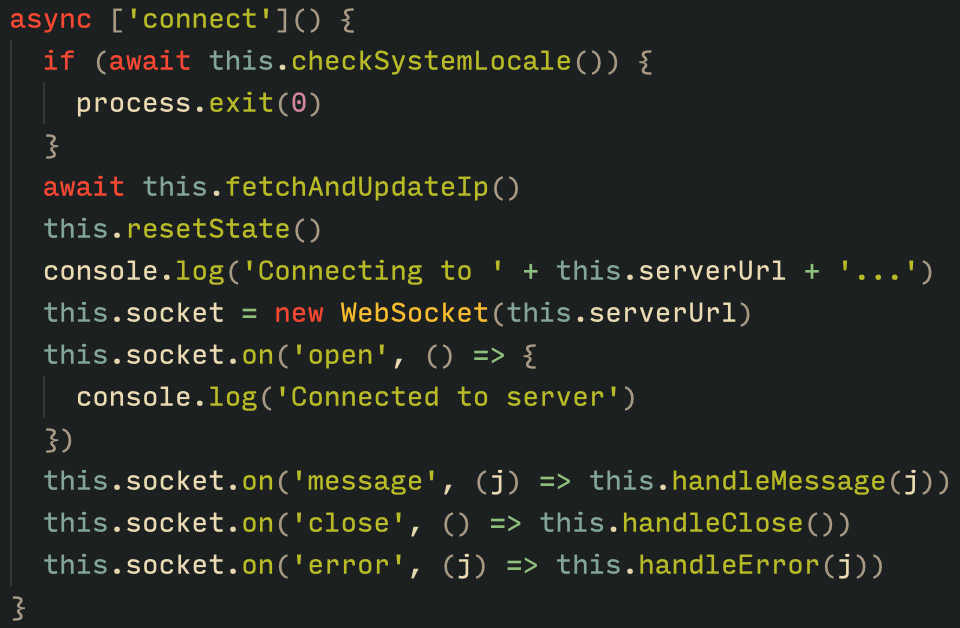 Bot Tsundere xác minh địa chỉ C2 bắt đầu bằng ws://hoặc wss://để đảm bảo đó là URL WebSocket hợp lệ, sau đó đặt chuỗi kết quả thu được làm URL máy chủ. Tuy nhiên, trước khi sử dụng URL mới này, bot sẽ kiểm tra ngôn ngữ hệ thống bằng cách lấy tên máy để tránh lây nhiễm cho các hệ thống trong vùng CIS. Nếu hệ thống không nằm trong vùng CIS, bot sẽ thiết lập kết nối đến máy chủ thông qua WebSocket, thiết lập các trình xử lý cần thiết để nhận, gửi và quản lý trạng thái kết nối, chẳng hạn như lỗi và socket đã đóng.