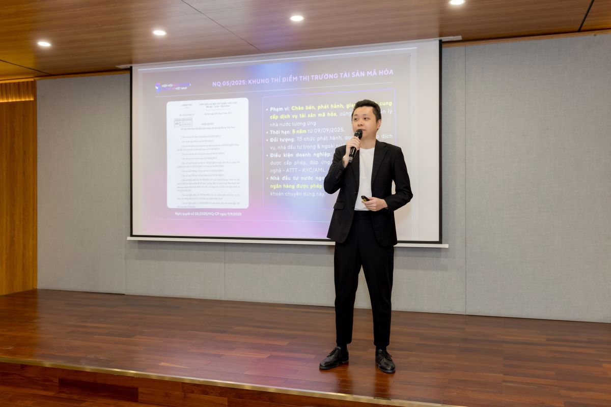 Ông Trần Huyền Dinh, Chủ nhiệm Ủy ban Ứng dụng Fintech, VBA cho biết cấu trúc năm lớp của mô hình token hoá tài sản thực (RWA) theo Chương trình Công nghệ Chiến lược Quốc gia, bao gồm: (1) Blockchain lớp nền có khả năng mở rộng; (2) Hạ tầng dữ liệu khả dụng phục vụ các ứng dụng công; (3) Nền tảng xác thực dữ liệu và truy xuất nguồn gốc quốc gia; (4) Nền tảng token hóa tài sản thực; (5) Hệ thống phân tích dữ liệu on-chain phục vụ giám sát giao dịch.