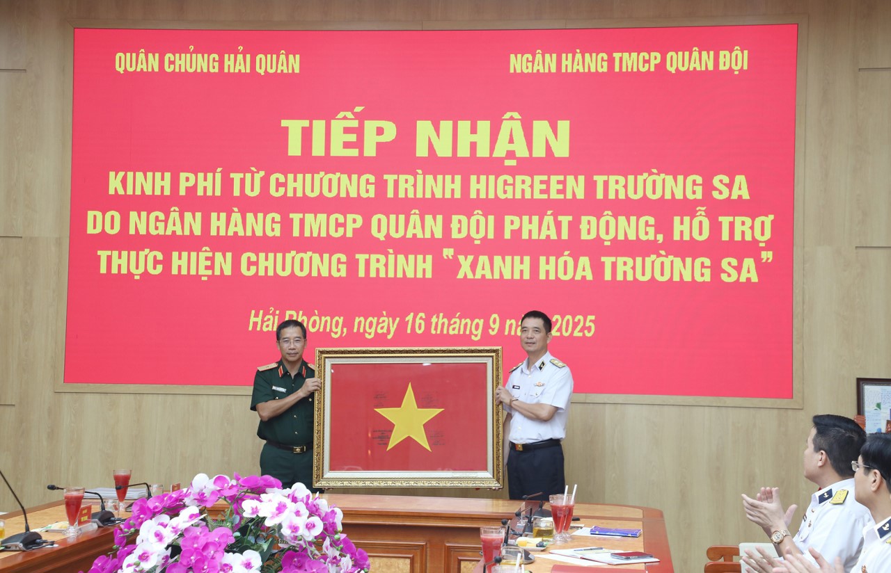 Đồng chí Bí thư Đảng ủy, Chủ tịch Hội đồng Quản trị MB trao biểu trưng kinh phí hỗ trợ xanh hóa Trường Sa của Chương trình “HiGreen Trường Sa” cho lãnh đạo Quân chủng Hải quân