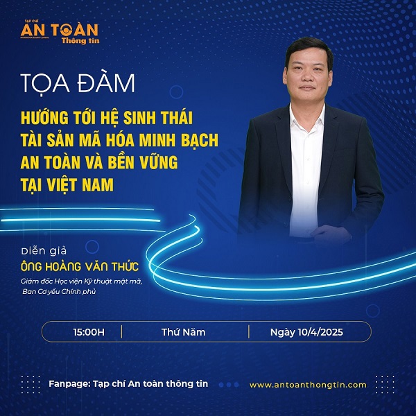 Để bàn luận rõ hơn về chủ đề “Hướng tới Hệ sinh thái tài sản mã hóa minh bạch, an toàn và bền vững tại Việt Nam”, Tạp chí An toàn thông tin sẽ tổ chức Tọa đàm với khách mời là ông Hoàng Văn Thức, Giám đốc Học viện Kỹ thuật mật mã, Ban Cơ yếu Chính phủ và ông Phan Đức Trung, Chủ tịch Hiệp hội Blockchain Việt Nam. Dự kiến, Toạ đàm sẽ được tường thuật trực tiếp vào hồi 15h ngày 10/4 trên Tạp chí điện tử và livestream trên fanpage của Tạp chí. Quý độc giả quan tâm vui lòng gửi câu hỏi tại đây.