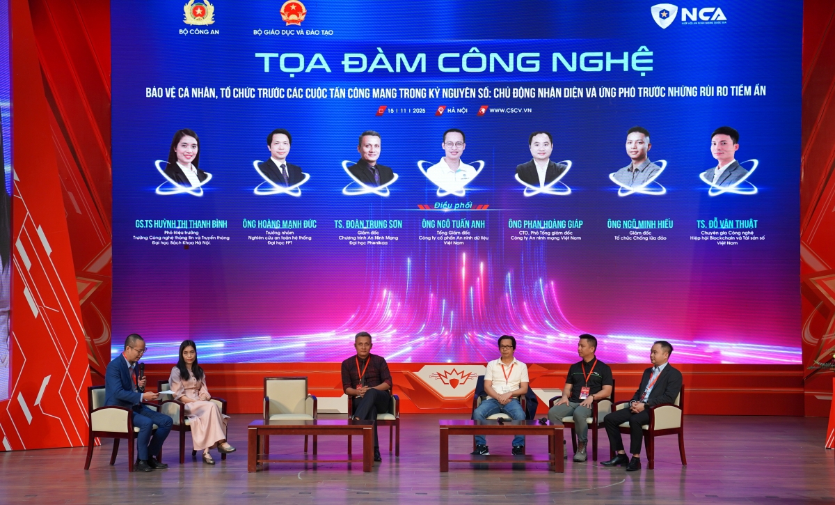 Trong khuôn khổ chuỗi các hoạt động sự kiện, các chuyên gia đầu Ngành thuộc lĩnh vực công nghệ, bảo mật thông tin như GS, TS. Huỳnh Thị Thanh Bình, Phó Hiệu trưởng Trường Công nghệ thông tin và Truyền thông, Đại học Bách Khoa Hà Nội; TS. Đoàn Trung Sơn, Giám đốc Chương trình An ninh mạng, Đại học Phenikaa; ông Hoàng Mạnh Đức, Trưởng nhóm Nghiên cứu An toàn hệ thống, Đại học FPT; ông Phan Hoàng Giáp, CTO, Phó Tổng Giám đốc Công ty An ninh mạng Việt Nam; ông Ngô Minh Hiếu (Hiếu PC), Giám đốc công ty Chống Lừa đảo, đã có buổi Tọa đàm công nghệ với chủ đề “Bảo vệ cá nhân, tổ chức trước các cuộc tấn công mạng trong kỷ nguyên số: Chủ động nhận diện và ứng phó trước những rủi ro tiềm ẩn”.