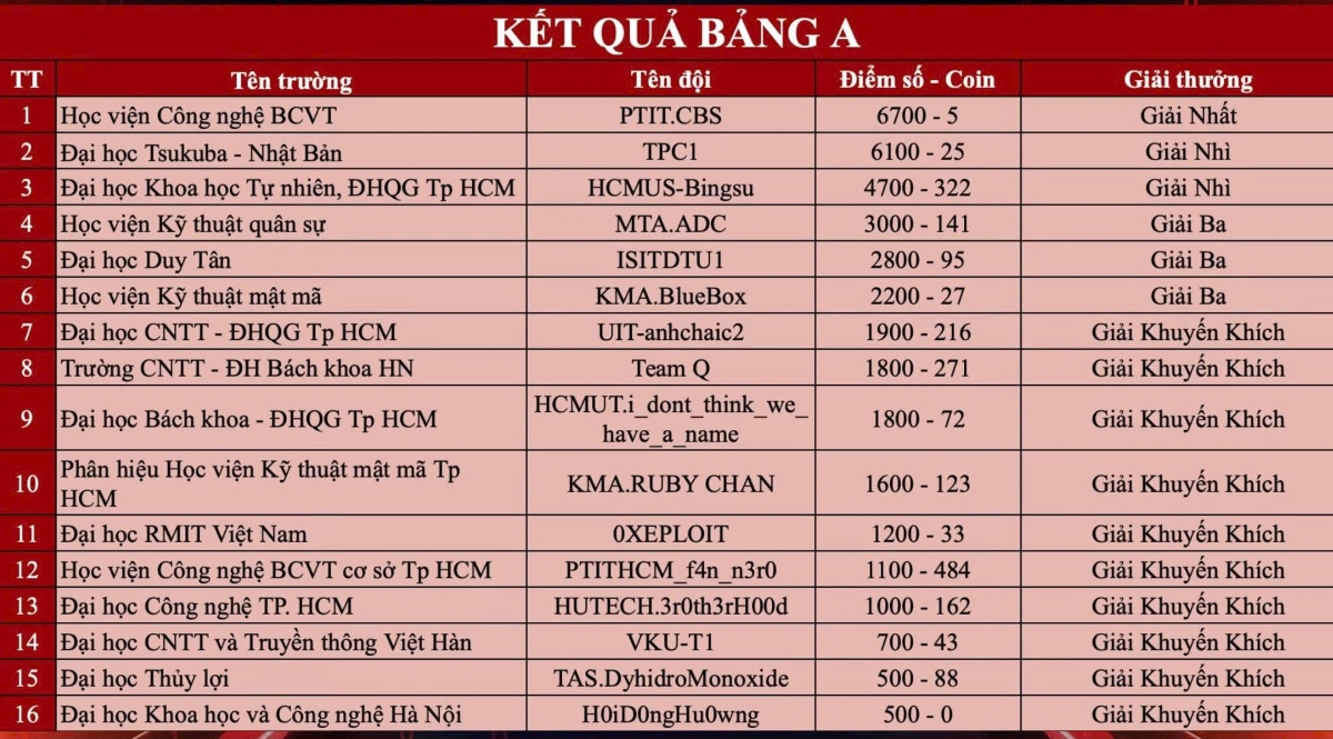 Ban Tổ chức trao giải Nhất bảng A cho đội PTIT.CBS đến từ Học viện Công nghệ Bưu chính Viễn thông với tổng số điểm 6700.