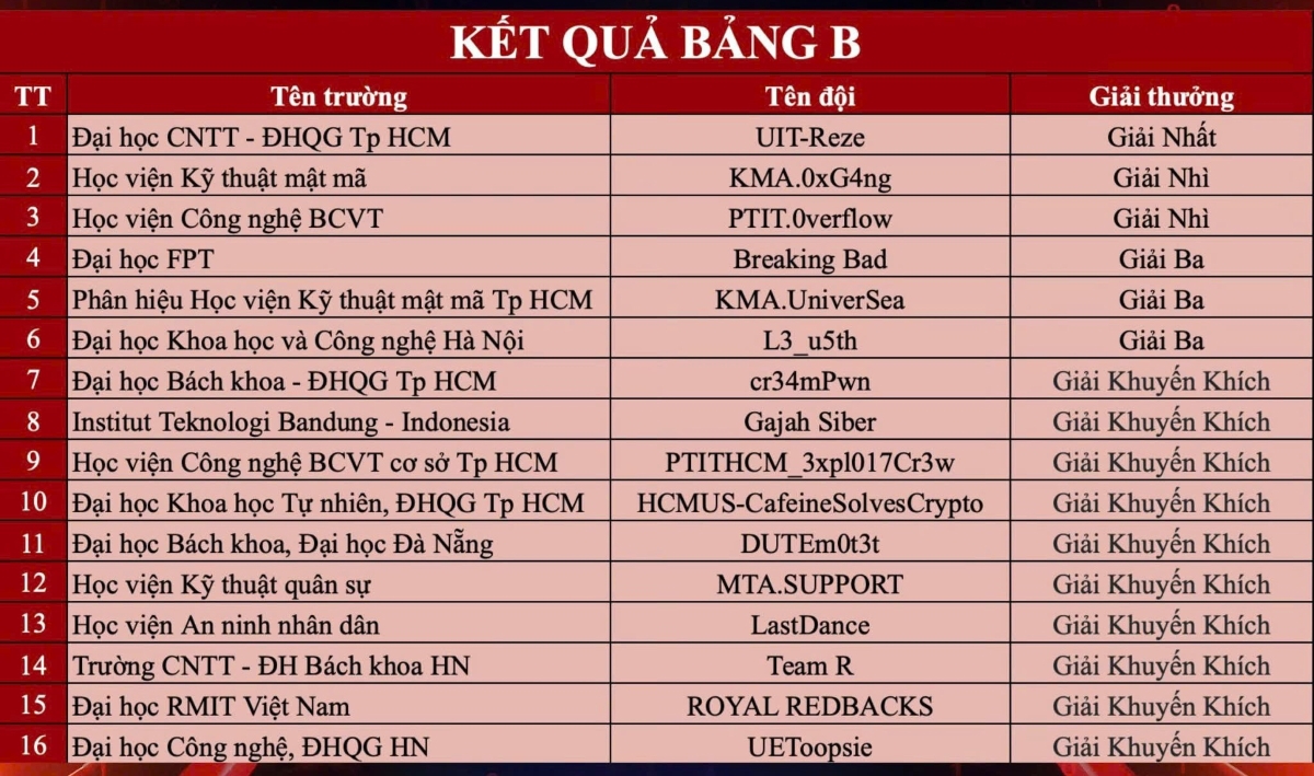Ở bảng B (Jeopardy CTF nâng cao), 56 đội thi trực tuyến đối mặt với các thử thách chuyên sâu về Web Security, Reverse Engineering, Pwnable, Cryptography và Forensics. Các nội dung này đòi hỏi tư duy chiến lược, khả năng phối hợp nhóm và kỹ năng kỹ thuật toàn diện, độ khó cao và được mở rộng thêm các chủ đề mới về AI, IoT, Blockchain so với vòng Sơ khảo.