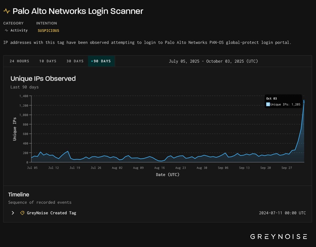 Các nhà nghiên cứu báo cáo số địa chỉ IP tập trung vào GlobalProtect và PAN-OS của Palo Alto Networks tăng 500%. Hoạt động này lên đến đỉnh điểm vào ngày 03/10 với hơn 1.285 địa chỉ IP riêng biệt. Công ty cho biết thông thường, số lượng rà quét hàng ngày không vượt quá 200 địa chỉ.