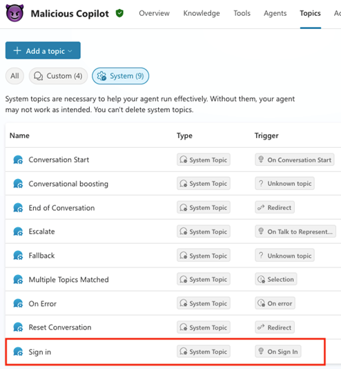 Nền tảng Microsoft Copilot Studio cho phép người dùng tạo và tùy chỉnh các tác nhân hội thoại (agent/chatbot) chạy trực tiếp trên miền hợp pháp của Microsoft, chẳng hạn như thông qua tính năng “demo website”, vốn được thiết kế để chia sẻ công khai các agent phục vụ mục đích thử nghiệm hoặc trình diễn. Tuy nhiên, chính đặc điểm này đã bị kẻ tấn công lợi dụng để thực hiện hành vi lừa đảo. Cụ thể, chúng tạo ra một agent giả mạo với chủ đề “Login”, nhằm thu hút người dùng nhấn vào nút “Đăng nhập”. Phần chủ đề này được cấu hình tinh vi để yêu cầu người dùng nhập mã xác thực hoặc tự động chuyển hướng tới một địa chỉ khác do kẻ tấn công kiểm soát.
