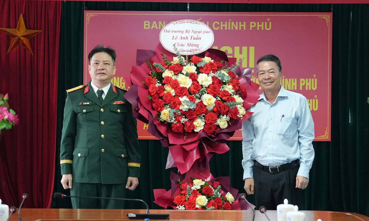 Thứ trưởng Bộ Ngoại giao Lê Anh Tuấn gửi tặng hoa chúc mừng Đại tá Hồ Văn Hương, Phó Trưởng ban Ban Cơ yếu Chính phủ.