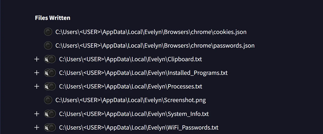 Theo Dardikman, 29 trong số 72 công cụ diệt vi-rút trên Virus Total đánh dấu tệp DLL là mối đe dọa. Phần mềm độc hại tạo một thư mục trong “%APPDATA%\Local\” và thư mục “Evelyn” để lưu trữ dữ liệu bị đánh cắp, bao gồm: thông tin chi tiết về các tiến trình đang chạy, nội dung clipboard, thông tin đăng nhập WiFi, thông tin hệ thống, ảnh chụp màn hình, danh sách các chương trình đã cài đặt và các tiến trình đang chạy.