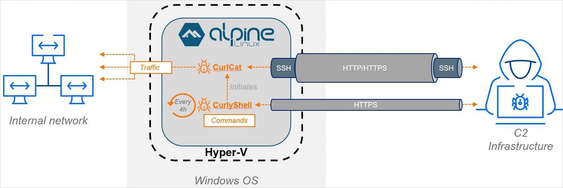 “Những kẻ tấn công đã kích hoạt role Hyper-V trên các hệ thống nạn nhân được chọn để triển khai một máy ảo tối giản dựa trên Alpine Linux. Môi trường ẩn này, với dung lượng nhẹ (chỉ 120MB dung lượng đĩa và 256MB bộ nhớ), lưu trữ reverse shell tùy chỉnh của chúng - CurlyShell và một reverse proxy là CurlCat", Bitdefender giải thích.