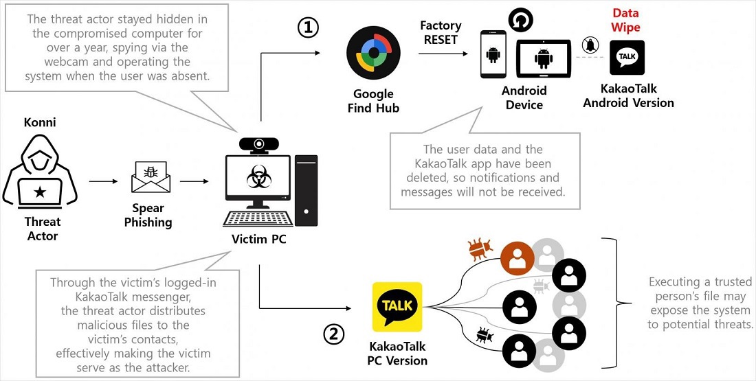 Theo các nhà nghiên cứu, KONNI thường đề cập đến một công cụ truy cập từ xa được sử dụng trong các cuộc tấn công của hai nhóm tin tặc trên, nhắm vào nhiều lĩnh vực như giáo dục, chính phủ và tiền điện tử. Chiến dịch này lây nhiễm máy tính bằng trojan, cho phép các tin tặc có thể đánh cắp dữ liệu nhạy cảm. Việc xóa toàn bộ dữ liệu (wipe data) trên thiết bị Android được thực hiện để cô lập nạn nhân, xóa dấu vết tấn công, trì hoãn quá trình khôi phục và tắt cảnh báo bảo mật. Cụ thể, việc “reset” sẽ ngắt kết nối nạn nhân khỏi các phiên KakaoTalk PC, mà kẻ tấn công sẽ chiếm quyền điều khiển sau khi xóa dữ liệu để lây lan sang danh bạ của mục tiêu.