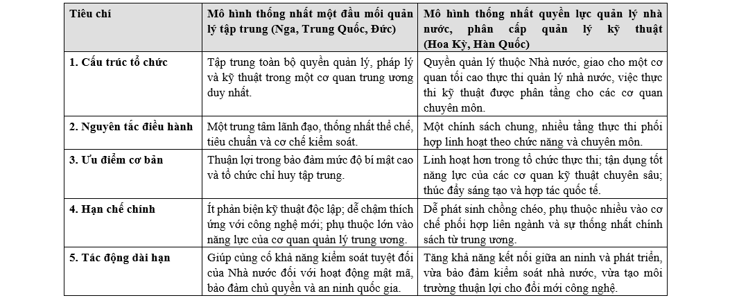 Kinh nghiệm quốc tế cho thấy, thống nhất quyền quản lý nhà nước về mật mã là nguyên tắc bất biến, gắn liền với chủ quyền số và năng lực tự chủ công nghệ của mỗi quốc gia. Dù được tổ chức theo mô hình tập trung một đầu mối hay phân tầng kỹ thuật dưới sự điều phối thống nhất, các nước đều đặt Nhà nước ở vị trí trung tâm, nắm quyền điều tiết toàn diện từ chính sách, tiêu chuẩn, chứng nhận đến kiểm soát ứng dụng. Mật mã không đơn thuần là kỹ thuật bảo vệ thông tin mà là trụ cột của an ninh quốc gia trong kỷ nguyên số - bảo đảm cho sự ổn định của Nhà nước, an toàn dữ liệu và niềm tin xã hội. Điểm khác biệt giữa các mô hình chỉ nằm ở cách phân công kỹ thuật và mức độ linh hoạt trong phối hợp, chứ không phải ở việc phân tán hay chia sẻ quyền quản lý.