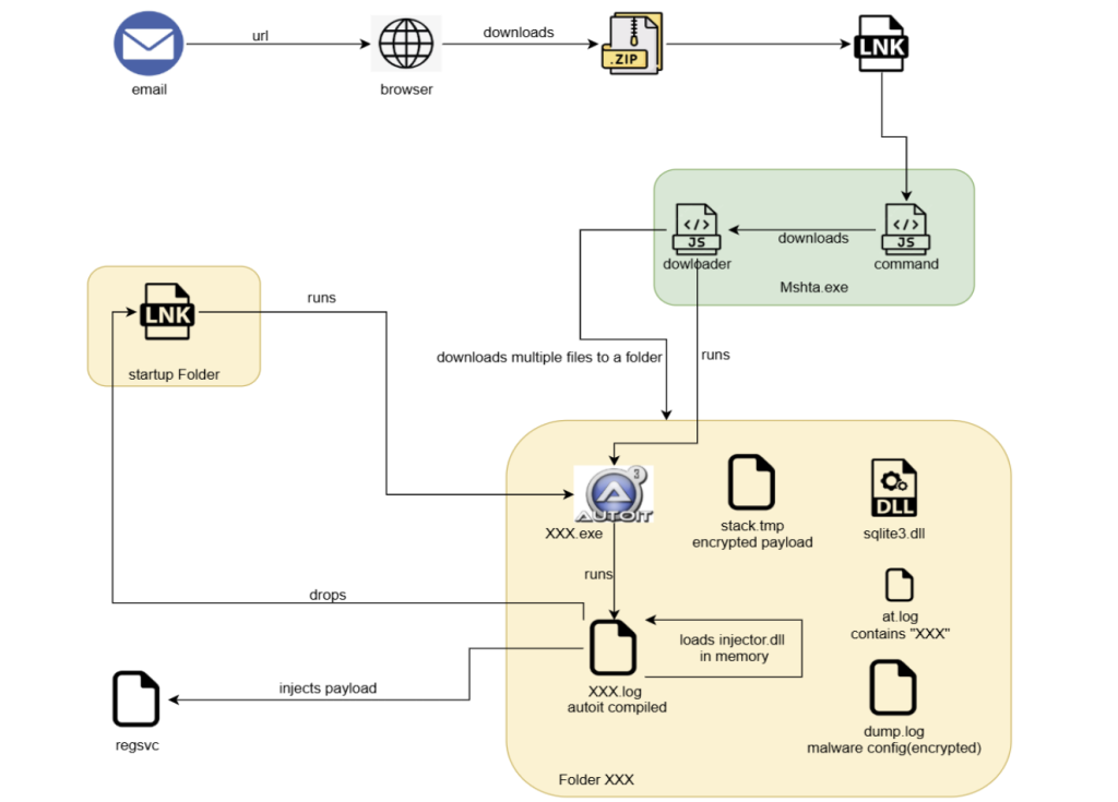 Tệp LNK chứa JavaScript được mã hóa, chịu trách nhiệm bổ sung JavaScript từ máy chủ bên ngoài. Về phần mình, mã JavaScript mới này sẽ tải xuống một số tệp từ một trong những máy chủ mã hóa cứng được chọn ngẫu nhiên, bao gồm một tập lệnh AutoIt thực thi bởi payload JavaScript nhằm chạy shellcode. Tiếp theo, shellcode tải DLL dựa trên Delphi để giải mã và đưa phần mềm độc hại Astaroth vào tiến trình RegSvc.exe mới tạo.
