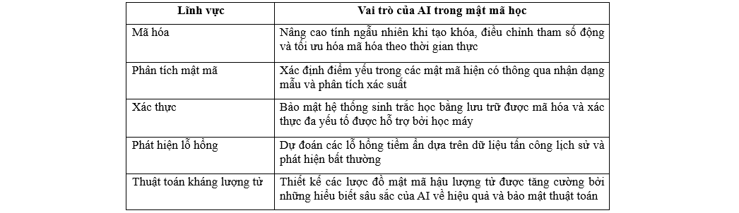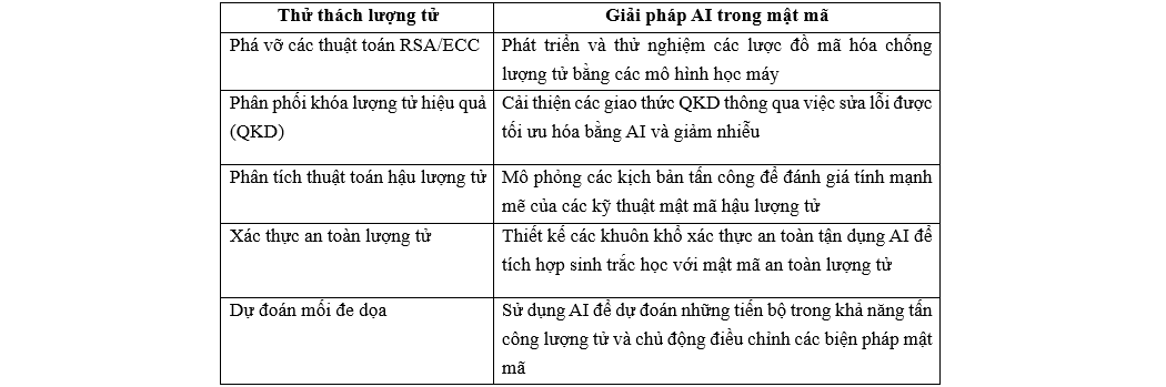 Bảng 2. Vai trò của AI trong việc giải quyết các thách thức của mật mã trước điện toán lượng tử
