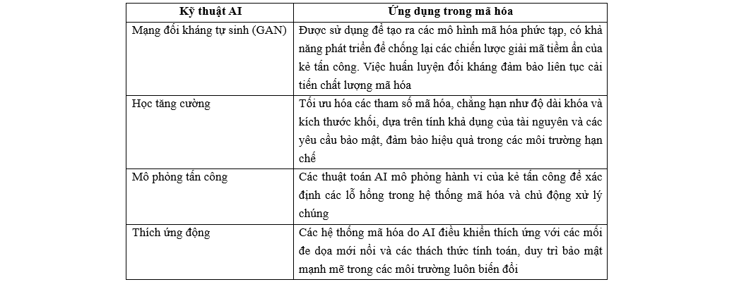 Bảng 4. Ứng dụng của AI trong tối ưu hóa và bảo mật hệ thống mã hóa