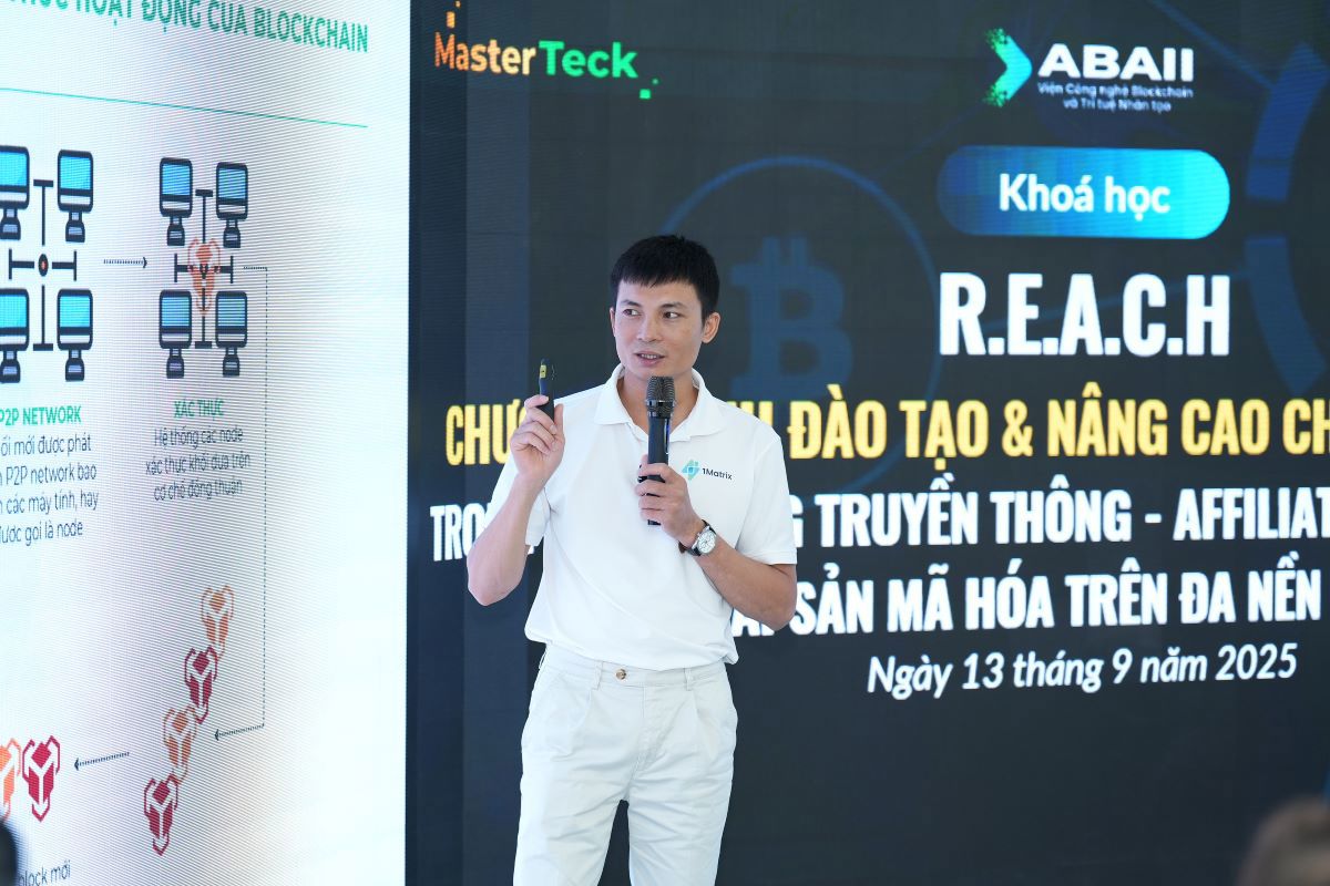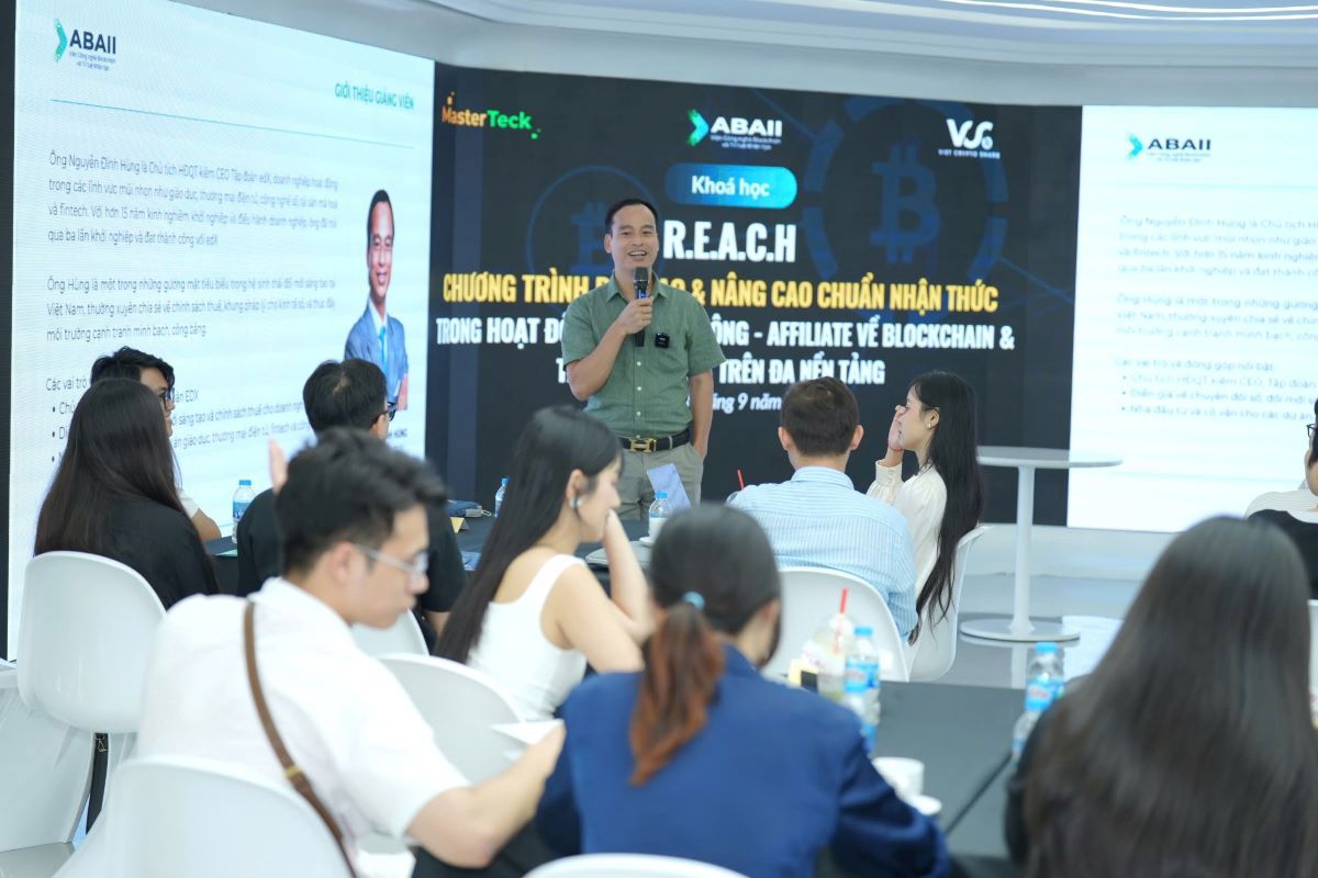 Phát biểu khai mạc, TS. Lê Linh Lương, Phó Viện trưởng Viện ABAII, nhấn mạnh: “Nghị quyết số 05/2025/NQ-CP đặt ra yêu cầu rất rõ về sự minh bạch và trách nhiệm khi tham gia thị trường tài sản mã hóa. Với R.E.A.C.H, chúng tôi muốn trang bị cho học viên không chỉ kiến thức nền tảng, mà còn là ý thức và kỹ năng truyền thông có trách nhiệm, để mỗi người trở thành một mắt xích tin cậy trong hệ sinh thái”.