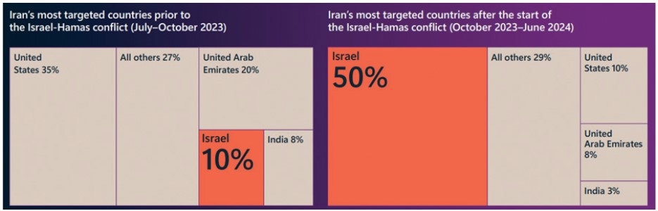 Báo cáo Phòng thủ Kỹ thuật số của Microsoft cho biết: "Sau khi xung đột Israel - Hamas nổ ra, Iran đã tăng cường các hoạt động trên không gian mạng và sử dụng không gian mạng để gây ảnh hưởng chống lại Israel". Từ ngày 07/10/2023 đến tháng 7/2024, gần một nửa số hoạt động mạng của Iran mà Microsoft quan sát được đều nhằm vào các tổ chức của Israel [1].