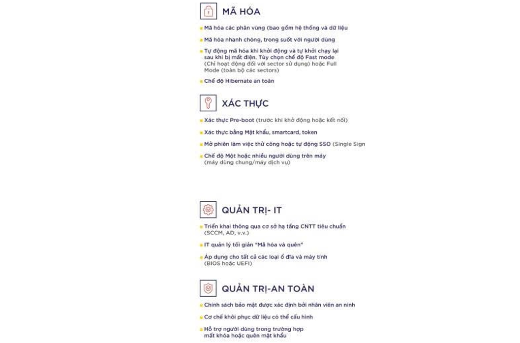 - Thuật toán Mã hóa: Sử dụng thuật toán MKV (thuật toán mã khối dân sự Việt Nam do Ban Cơ yếu Chính phủ nghiên cứu) hoặc thuật toán AES 256 đảm bảo tiêu chuẩn bảo mật mạnh mẽ.