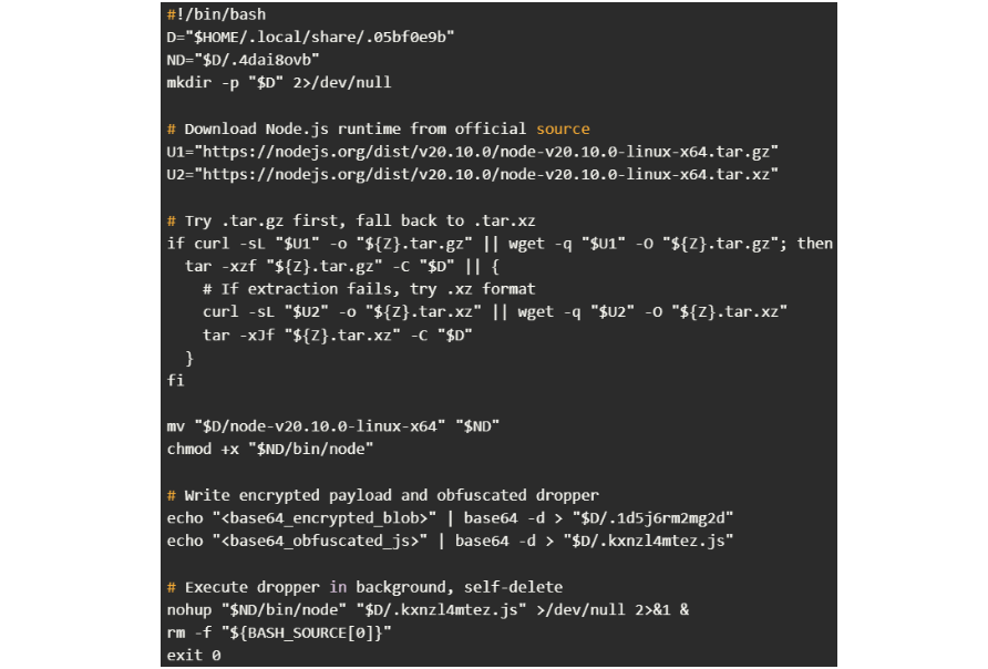 Đoạn mã này tạo một thư mục ẩn trong $HOME/.local/share/ của người dùng, nơi nó tải xuống và giải nén môi trường chạy Node.js v20.10.0 hợp lệ trực tiếp từ nodejs.org. Sau đó, nó ghi một payload blob được mã hóa và một nhúng JavaScript độc hại bằng cách sử dụng tệp nhị phân Node đã tải xuống, rồi tự xóa chính nó. JavaScript này được làm rối nghĩa (.kxnzl4mtez.js), giải mã blob bằng khóa AES-256-CBC và ghi kết quả dưới dạng một tệp JavaScript ẩn khác.