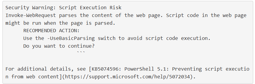 Để tránh tình trạng các tập lệnh tự động hóa bị treo cho đến khi được xác nhận thủ công, người dùng nên cập nhật các tập lệnh của mình để sử dụng tham số an toàn UseBasicParsing một cách rõ ràng.